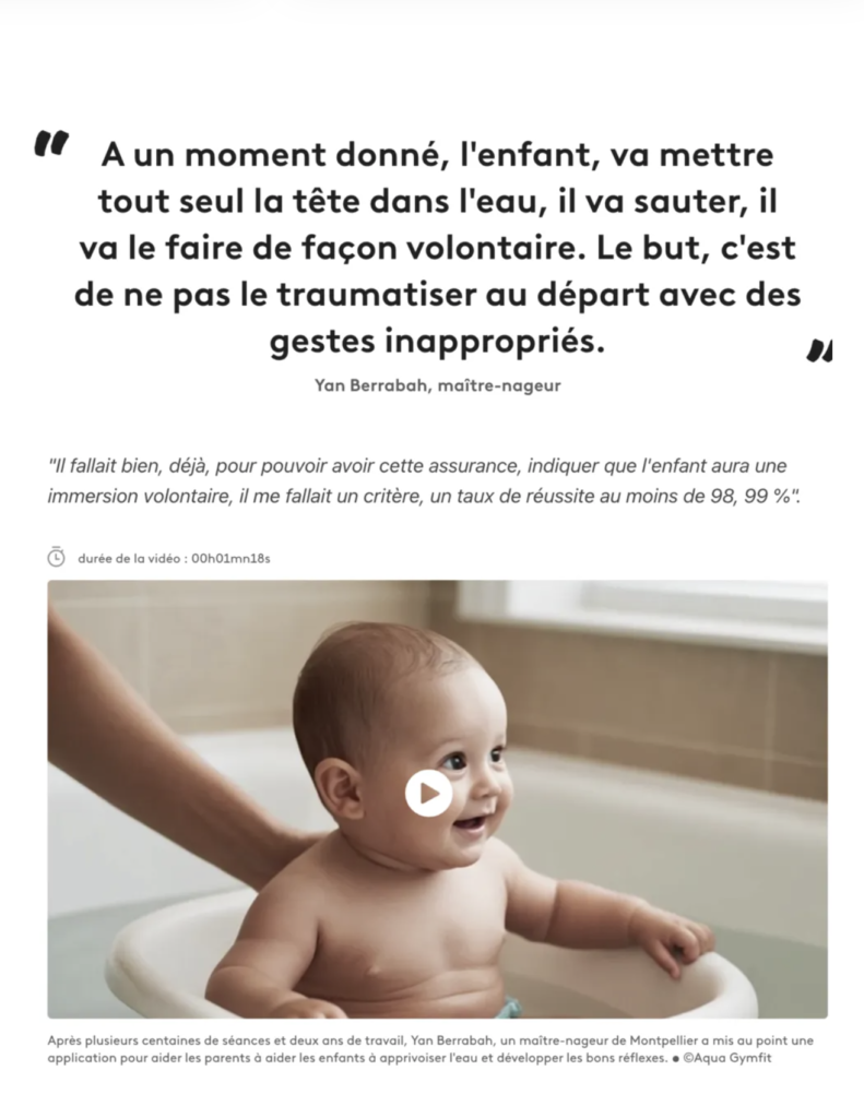 Avec Baby Slow, aucune immersion n’est provoquée. L’enfant découvre l’eau à son rythme et l’immersion apparaît naturellement lorsqu’il se sent prêt. L’expérience reste douce et sécurisante.